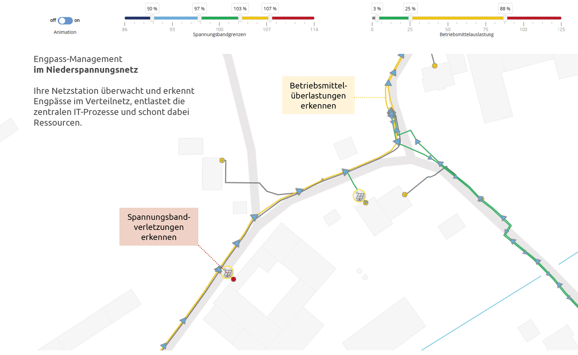 Dank Edge Computing und digitalem Zwilling kennen Sie den Zustand an den entscheidenden Knotenpunkten und werden über die automatische Engpasserkennung über kritische Netzsituationen informiert.