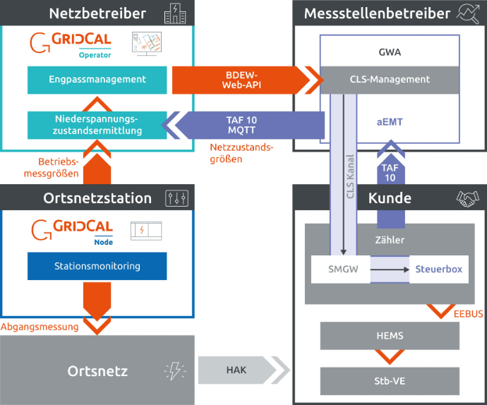 Zusätzliche TAF 10 Daten kann der Operator über MQTT (Message Queuing Telemetry Transport) vom aEMT des Messstellenbetreibers beziehen und sendet im Gegenzug für das Engpassmanagement Daten via BDEW-Web-API an das CLS-Management des Messstellenbetreibers. Mittels Gateway-Administrator (via CLS-Kanal) gehen anschließend die Steuerbefehle an die Steuerbox bis zum HEMS und die Verbrauchseinrichtungen eines Kunden.